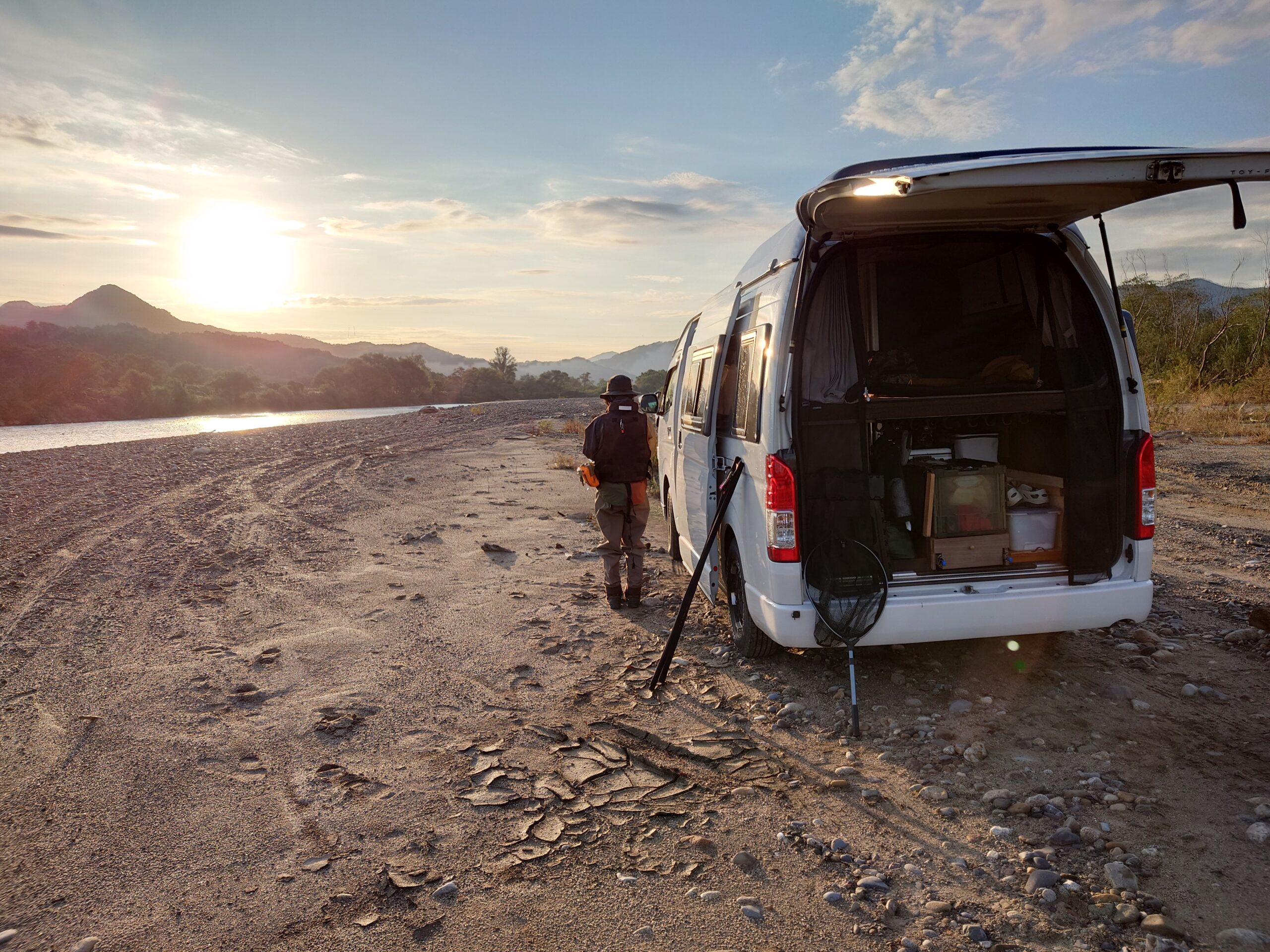 トイファクトリー社のコルドバクルーズはハイエーススーパーロングをベースにしたバンコンキャンピングカーで、 上質な内装家具に マルチルーム(トイレ)と 常設ベッド・冷蔵庫・FFヒーターなどが基本装備になっている。そして常設ベッドの下部には広いラゲッジスペースがあり釣り道具やキャンプ道具をたくさん積み込むことができる。また釣り旅では悪路を走行することを前提に、ベース車は4WDにLSD(リミッテッド・スリップ・デファレンシャル)を選んでいる。