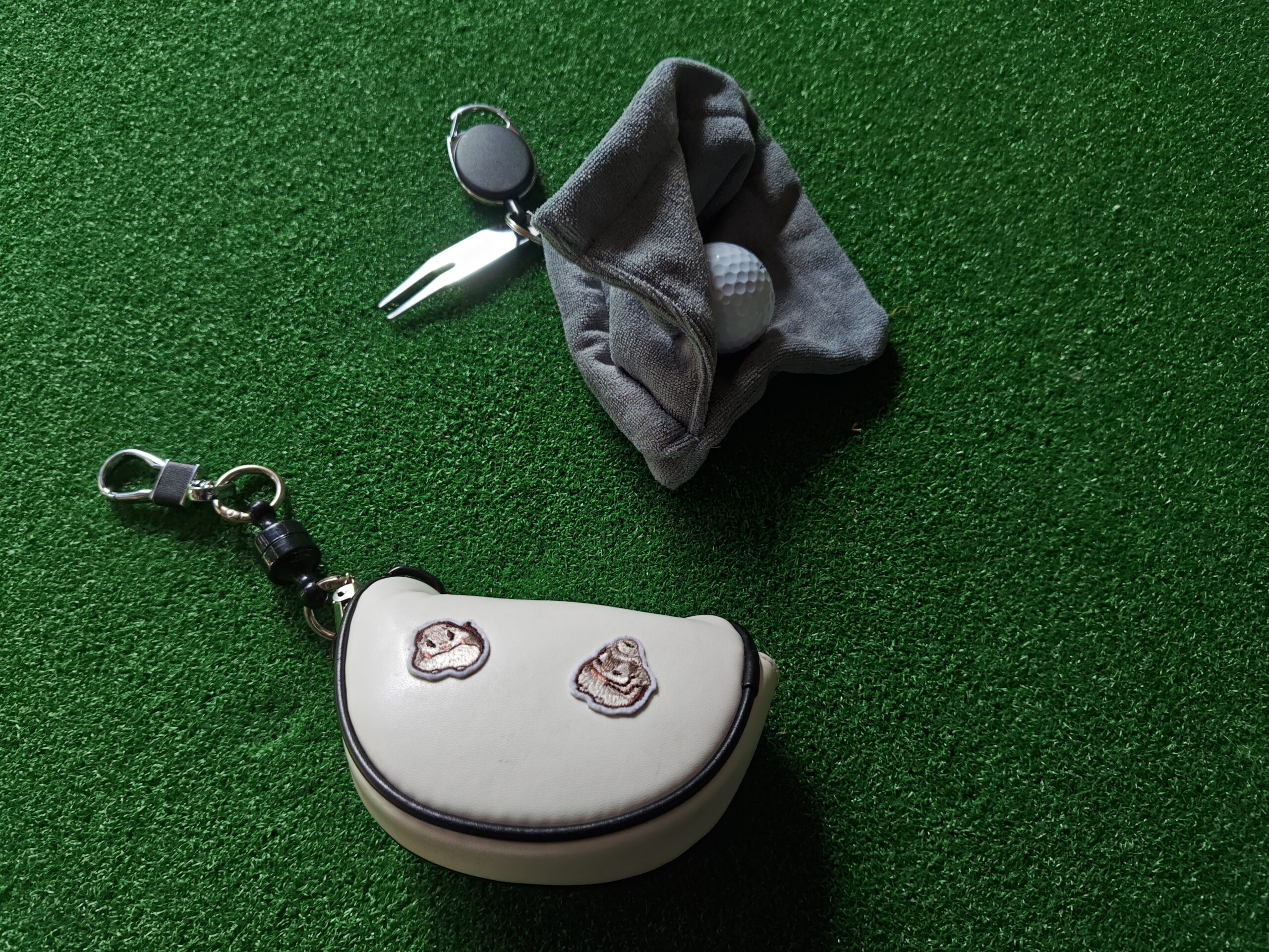 ベルト通しに取り付けてタオル(付属)とパターカバーをマグネットで接続する、マグネットジョイントは釣りのランディングネットで使っていて違和感もないので使い易い。またパターカバーに取り付ける金具もしっかり固定できる、付属のボール拭きの布は小さめで折りたたんで縫製されているのでボールが拭きやすくて良い。またカラビナ付きリールも付いているので使い方もいろいろ考えることができる。
